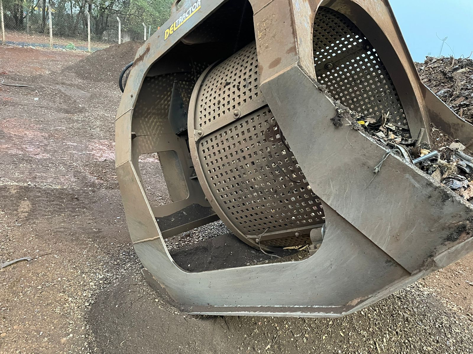 Fabricamos o modelo DELPR2000 com largura Boca 1800 mm, cesta (peneira) 1400x1200 mm, peso 2000 kgs, capacidade de carga 1.3 m³, pressão 180 bar, vazão 80~110 l/mim, rotação 10~30 rpm.
