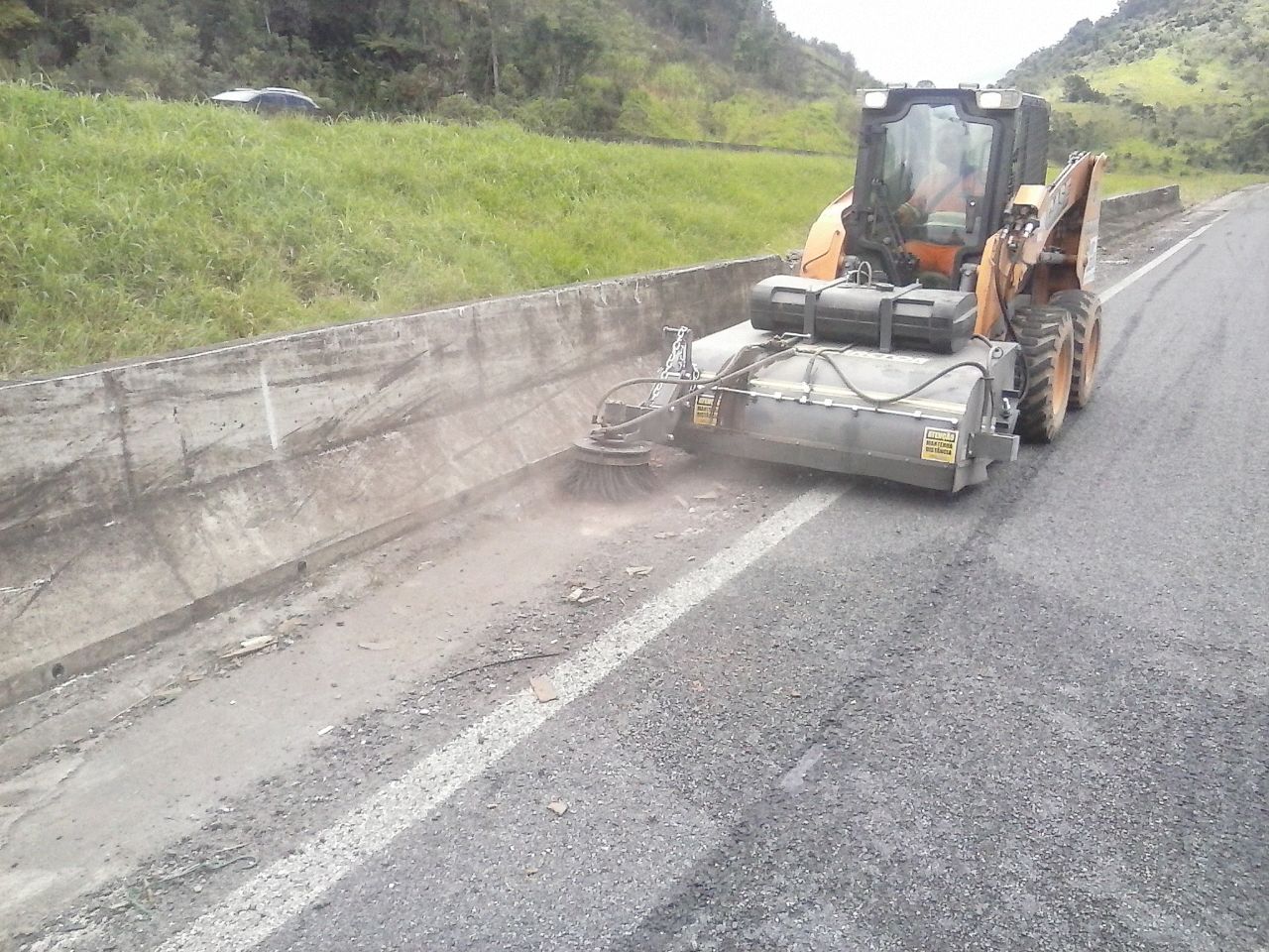 A vassoura lateral é conectada a vassoura recolhedora através da linha hidráulica, sistema com registro que permite liga-la somente quando necessário, regulagem de altura e regulagem lateral que permite aproveitar o melhor desempenho conforme o tipo de terreno e serviço pode ser instalada com cerda de polipropileno ou cabos de aço.